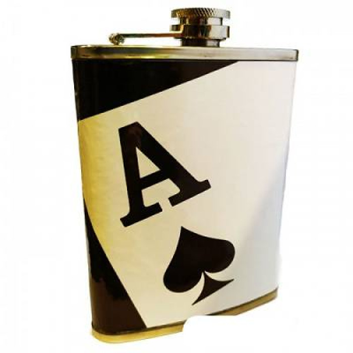 Этот аксессуар сразу привлекает внимание своим оформлением – принт с изображением туза пик нанесен качественно, краска не трескается и не облазит от постоянного контакта с руками. Сама емкость сделана из проверенной нержавеющей стали, которая не меняет запах содержимого, даже если оно находится внутри довольно долго.