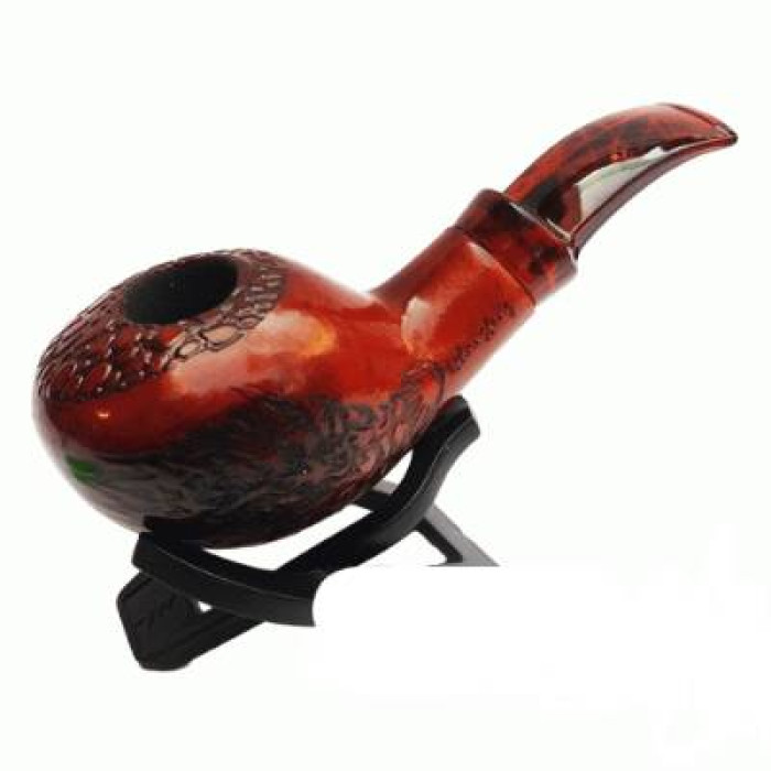 Форма трубки удобная, чаша довольно большая, мундштук изгибается под комфортным углом, поэтому ее легко держать в зубах. Края ровные и гладкие. В комплекте есть черная подставка-тренога. Она устойчивая, хорошо фиксирует трубку, не переворачивается.