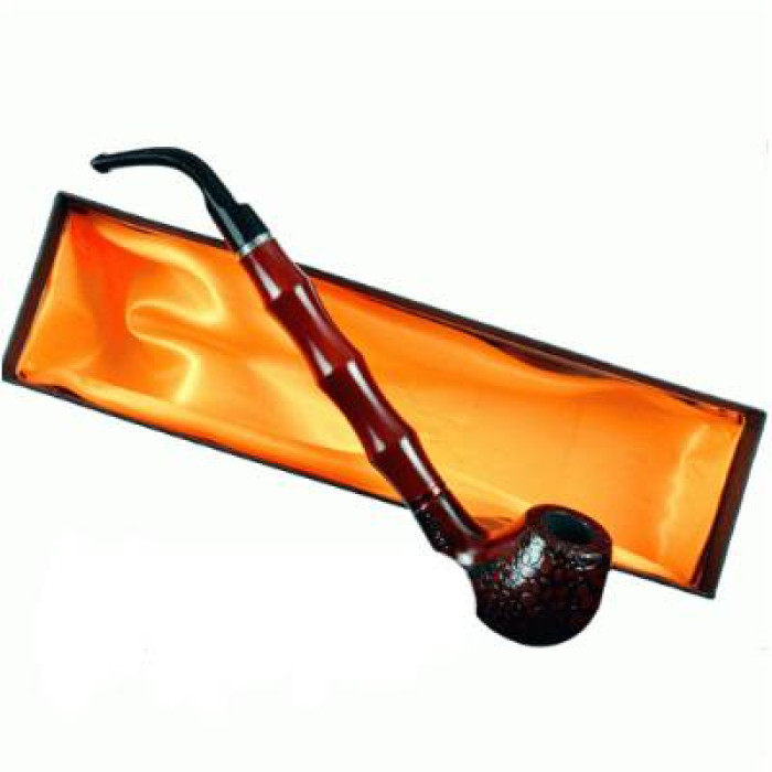 Курительная трубка выполнена из темного дерева с выразительной природной текстурой и аккуратной полировкой. Глубокий бордово-коричневый оттенок чаши гармонично сочетается с черным пластиковым мундштуком.